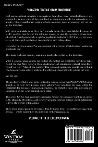 "RELOVUTIONARY' clearly demonstrates that Jonny King has something of value to say to the church in these days. I commend his book to you." -Jeff Crosby, Publisher, InterVarsity Press/USA PHILOSOPHY FOR TRUE HUMAN FLOURISHING Each person without exception is desperate for flourishing. Every individual hungers and aches to live an expression of the good life. This compulsion inside is as automatic as it is intuitive. This general human longing reflects a common drive for meaning, and not just for the Christian. Still, most intimately know they can't entirely do life their way. Whilst the majority readily confess, they haven't the sufficient means, or even the necessary power. After all, look at what happens when a global pandemic shuts down life?! The fact we rarely arrive at contented satisfaction becomes life's own rolling stone. Do you have a present vision? Are you confident of the process? What about any worthwhile or ultimate goal? This living challenge becomes even more practically specific for the Christian. What if someone asked you for the content of a faithful and fruitful life for Christ? What would you say? Now factor in these challenging and confronting cultural times. How would you reply? After all, you sincerely love Jesus, and passionately want to live for Him, which means you're entirely motivated to offer something not only realistic, but true. But can you? The good news is that in your hands contain the opening lines, where RELOVUTIONARY intends to be your own personal guide. Volume One introduces this idea, setting the coordinates for the reader's unfolding navigation. The context is huge, only increasing any anticipation on this series' comprehensive value. This Is Your Life has been genuinely engineered for any curious reader wanting an answer to the absurdity of existence, and for every genuine follower of Jesus Christ, determined to live a life worthy of His calling. There is no greater promise or purpose than living for Jesus-no matter age, stage, time, or place-which means there should be no further reading delay. WELCOME TO THE LIFE: RELOVUXIONARY