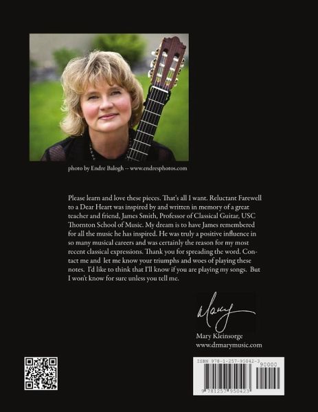 "Reluctant Farewell to a Dear Heart" is a collection of original classical guitar compositions inspired by and written in memory of my great teacher and friend, James Smith, Professor of Classical Guitar, USC Thornton School of Music. Written in both tablature and notation, players of all levels will find something to challenge them in these pieces and will want to play them again and again. Recordings are also available. My dream is that Professor James Smith be remembered for all the music he has inspired. He was truly a positive influence in so many musical careers and was certainly the reason for this, my most recent classical expression. Thank you, Jim, for your inspiration and friendship. I hope you can hear as these pieces are played for you. I miss you. Please learn and love these pieces.