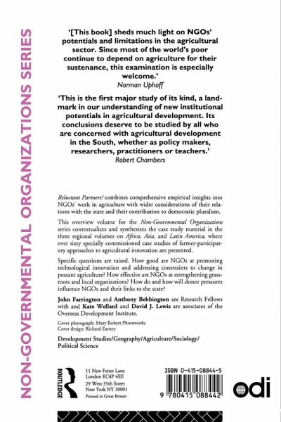 Reluctant Partners? combines comprehensive empirical insights into NGOs' work in agriculture with wider considerations of their relations with the State and their contribution to democratic pluralism. This overview volume for the Non-Governmental Organizations series contextualizes and synthesizes the case study material in the three regional volumes on Africa, Asia and Latin America, where over sixty specially commissioned case studies of farmer-participatory approaches to agricultural innovation are presented. Specific questions are raised. How good/bad are NGOs at promoting technological innovation and addressing contraints to change in peasant culture? How effective are NGOs at strengthening local organizations? How do/will donor pressures influence NGOs and their links to the State?