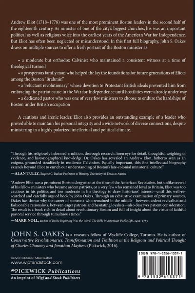 Andrew Eliot (1718–1778) was one of the most prominent Boston leaders in the second half of the eighteenth century. As minister of one of the city’s biggest churches, his was an important political as well as religious voice into the earliest years of the American War for Independence. But Eliot has often been neglected or misunderstood. In this first full biography, John S. Oakes draws on multiple sources to offer a fresh portrait of the Boston minister as: • a moderate but orthodox Calvinist who maintained a consistent witness at a time of theological turmoil • a prosperous family man who helped the lay the foundations for future generations of Eliots among the Boston "Brahmin" • a "reluctant revolutionary" whose devotion to Protestant British ideals prevented him from embracing the patriot cause in the War for Independence until hostilities were already under way • a dedicated pastor who was one of very few ministers to choose to endure the hardships of Boston under British occupation A cautious and irenic leader, Eliot also provides an outstanding example of a leader who proved able to maintain his personal integrity and a wide network of diverse connections, despite ministering in a highly polarized intellectual and political climate.