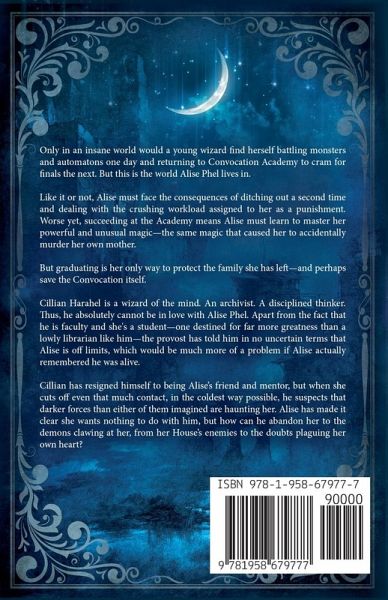 Only in an insane world would a young wizard find herself battling monsters and automatons one day and returning to Convocation Academy to cram for finals the next. But this is the world Alise Phel lives in. Like it or not, Alise must face the consequences of ditching out a second time and dealing with the crushing workload assigned to her as a punishment. Worse yet, succeeding at the Academy means Alise must learn to master her powerful and unusual magic-the same magic that caused her to accidentally murder her own mother. But graduating is her only way to protect the family she has left-and perhaps save the Convocation itself. Cillian Harahel is a wizard of the mind. An archivist. A disciplined thinker. Thus, he absolutely cannot be in love with Alise Phel. Apart from the fact that he is faculty and she's a student-one destined for far more greatness than a lowly librarian like him-the provost has told him in no uncertain terms that Alise is off limits, which would be much more of a problem if Alise actually remembered he was alive. Cillian has resigned himself to being Alise's friend and mentor, but when she cuts off even that much contact, in the coldest way possible, he suspects that darker forces than either of them imagined are haunting her. Alise has made it clear she wants nothing to do with him, but how can he abandon her to the demons clawing at her, from her House's enemies to the doubts plaguing her own heart?