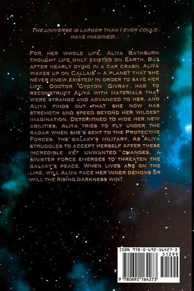 The universe is larger than I ever could have imagined… For her whole life, Aliya Rathburn thought life only existed on Earth. But after nearly dying in a car crash, Aliya wakes up on Callais - a planet that she never knew existed. In order to save her life, Doctor Gydyon Givray had to reconstruct Aliya with materials that were strange and advanced to her, and Aliya finds out that she now has strength and speed beyond her wildest imagination. Determined to hide her new abilities, Aliya tries to fly under the radar when she's sent to the Protective Forces, the galaxy's military. As Aliya struggles to accept herself after these incredible yet unwanted changes, a sinister force emerges to threaten the galaxy's peace. When lives are on the line, will Aliya face her inner demons or will the rising darkness win?