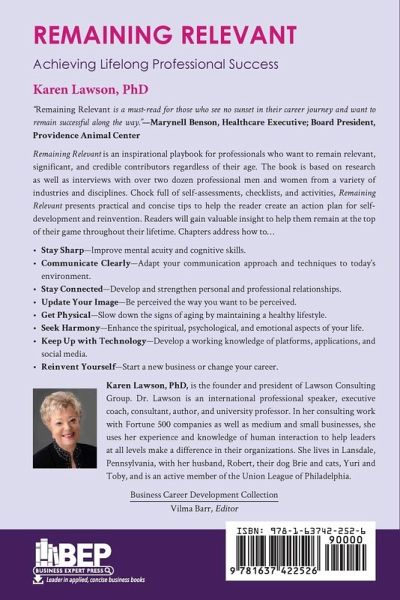Achieve Lifelong Professional Success Remaining Relevant is an inspirational playbook for professionals who want to remain relevant, significant, and credible contributors regardless of their age. The book is based on research as well as interviews with over two dozen professional men and women from a variety of industries and disciplines. Chock full of self-assessments, checklists, and activities, Remaining Relevant presents practical and concise tips to help the reader create an action plan for self-development and reinvention. Readers will gain valuable insight to help them remain at the top of their game throughout their lifetime. Chapters address how to... Stay Sharp - Improve mental acuity and cognitive skills. Communicate Clearly - Adapt your communication approach and techniques to today's environment. Stay Connected - Develop and strengthen personal and professional relationships. Update Your Image - Be perceived the way you want to be perceived. Get Physical - Slow down the signs of aging by maintaining a healthy lifestyle. Seek Harmony - Enhance the spiritual, psychological, and emotional aspects of your life. Keep Up with Technology - Develop a working knowledge of platforms, applications, and social media. Reinvent Yourself - Start a new business or change your career.