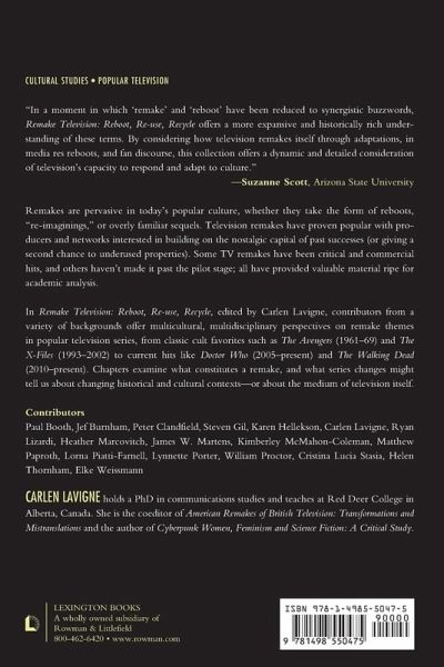 Remakes are pervasive in today's popular culture, whether they take the form of reboots, "re-imaginings," or overly familiar sequels. Television remakes have proven popular with producers and networks interested in building on the nostalgic capital of past successes (or giving a second chance to underused properties). Some TV remakes have been critical and commercial hits, and others haven't made it past the pilot stage; all have provided valuable material ripe for academic analysis. In Remake Television: Reboot, Re-use, Recycle, edited by Carlen Lavigne, contributors from a variety of backgrounds offer multicultural, multidisciplinary perspectives on remake themes in popular television series, from classic cult favorites such as The Avengers (1961-69) and The X-Files (1993-2002) to current hits like Doctor Who (2005-present) and The Walking Dead (2010-present). Chapters examine what constitutes a remake, and what series changes might tell us about changing historical and cultural contexts-or about the medium of television itself.