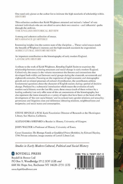 A tribute to the work of Keith Wrightson, Remaking English Society re-examines the relationship between enduring structures and social change in early modern England. Collectively, the essays in the volume reconstruct the fissures and connections that developed both within and between social groups during the sixteenth, seventeenth and eighteenth centuries. Focusing on the experience of rapid economic and demographic growth and on related processes of cultural diversification, the contributors address fundamental questions about the character of English society during a period of decisive change. Prefaced by a substantial introduction which traces the evolution of early modern social history over the last fifty years, these essays (each of them written by a leading authority) not only offer state-of-the-art assessments of the historiography but also represent the latest research on a variety of topics that have been at the heart of the development of 'the new social history' and its cultural turn: gender relations and sexuality; governance and litigation; class and deference; labouring relations, neighbourliness and reciprocity; and social status and consumption. STEVE HINDLE is W. M. Keck Foundation Director of Research at the Huntington Library, San Marino, California. ALEXANDRA SHEPARD is Reader in History, University of Glasgow. JOHN WALTER is Professor of History, University of Essex. Contributors: Helen Berry, Adam Fox, H. R. French, Malcolm Gaskill, Paul Griffiths, Steve Hindle, Craig Muldrew, Lindsay O'Neill, Alexandra Shepard, Tim Stretton, Naomi Tadmor, John Walter, Phil Withington, Andy Wood