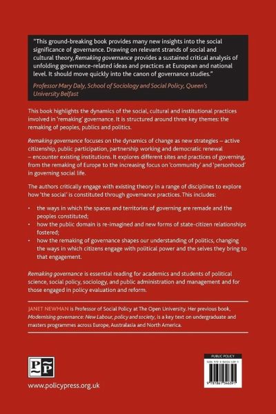 There has been an explosion of new forms of governance as societies adapt to economic, social and political change. This book highlights the dynamics of the social, cultural and institutional practices involved in 'remaking' governance. It is structured around three key themes: the remaking of peoples, publics and politics.