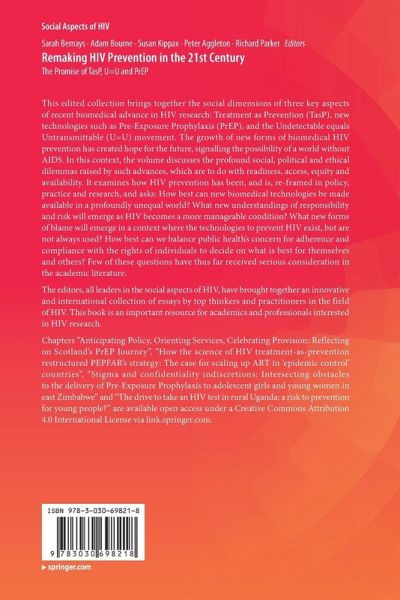 This edited collection brings together the social dimensions of three key aspects of recent biomedical advance in HIV research: Treatment as Prevention (TasP), new technologies such as Pre-Exposure Prophylaxis (PrEP), and the Undetectable equals Untransmittable (U=U) movement. The growth of new forms of biomedical HIV prevention has created hope for the future, signalling the possibility of a world without AIDS. In this context, the volume discusses the profound social, political and ethical dilemmas raised by such advances, which are to do with readiness, access, equity and availability. It examines how HIV prevention has been, and is, re-framed in policy, practice and research, and asks: How best can new biomedical technologies be made available in a profoundly unequal world? What new understandings of responsibility and risk will emerge as HIV becomes a more manageable condition? What new forms of blame will emerge in a context where the technologies to prevent HIV exist, but arenot always used? How best can we balance public health's concern for adherence and compliance with the rights of individuals to decide on what is best for themselves and others? Few of these questions have thus far received serious consideration in the academic literature.