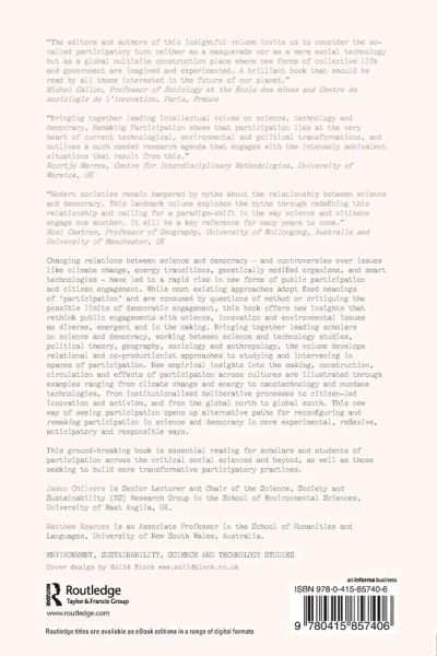 Changing relations between science and democracy - and controversies over issues such as climate change, energy transitions, genetically modified organisms and smart technologies - have led to a rapid rise in new forms of public participation and citizen engagement. While most existing approaches adopt fixed meanings of 'participation' and are consumed by questions of method or critiquing the possible limits of democratic engagement, this book offers new insights that rethink public engagements with science, innovation and environmental issues as diverse, emergent and in the making. Bringing together leading scholars on science and democracy, working between science and technology studies, political theory, geography, sociology and anthropology, the volume develops relational and co-productionist approaches to studying and intervening in spaces of participation. New empirical insights into the making, construction, circulation and effects of participation across cultures are illustrated through examples ranging from climate change and energy to nanotechnology and mundane technologies, from institutionalised deliberative processes to citizen-led innovation and activism, and from the global north to global south. This new way of seeing participation in science and democracy opens up alternative paths for reconfiguring and remaking participation in more experimental, reflexive, anticipatory and responsible ways.