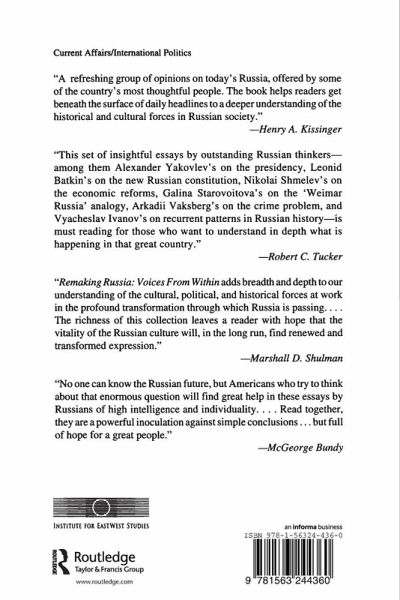 In the words of George F. Kennan, Russia remains a region where "the conflicts of outlook and persuasion" have been as violent as any seen in our century. As crisis follows crisis, Western observers find the tragic complexities and cruel paradoxes of post-totalitarian Russia no less mystifying than those they encountered during the Soviet era. Looking beyond the horizon and cutting beneath the headlines, in Remaking Russia eighteen distinguished essayists of diverse backgrounds offer original insights on the three central questions Russians are now debating among themselves: Who are we? Where are we going? How do we get there? Their perspectives will retain their long-term relevance whatever the outcome of Kremlin power struggles.