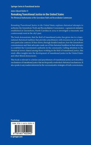 Remaking Transitional Justice in the United States: The Rhetoric of the Greensboro Truth and Reconciliation Commission explores rhetorical attempts to authorize the Greensboro Truth and Reconciliation Commission-a grassroots, U.S.-based truth commission created in 2004 toredress past injustices in the city. Through detailed rhetorical analyses, the book demonstratesthat the development of the field of transitional justice has given rise to a transnational rhetorical tradition that provides those working in the field with series of "enabling constraints." The book then shows how Greensboro stakeholders attempted to reaccentuate this rhetorical tradition in their rhetorical performances to construct authority and bring about justice, even as the tradition shaped their discourse in ways that limited the scope of their responses. Calling attention to the rhetorical interdependence among practitioners of transitional justice, this study offers insights into the development of transitional justice in the United States and in grassroots contexts in other liberal democracies. The volume is a relevant guide to scholars and practitioners of transitional justice as it brings into relief mechanisms of transitional justice that are frequently overlooked-namely, rhetorical mechanisms. It also speaks to any readers who may be interested in the communicative strategies/tactics that may be employed by grassroots transitional justice initiatives.