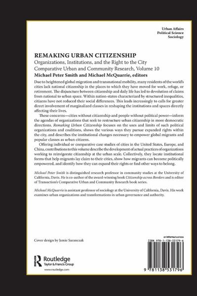 I: Conceiving and Locating C itizenship; 1: Remaking Urban Citizenship; 2: The Fluid, Multi-scalar, and Contradictory Construction of Citizenship; II: The R ght to the City : Political Project and Urban Characteristic; 3: Citizens in Search of a City: Towards a New Infrastructure of Political Belonging; 4: Urban Citizenship in New York, Paris, and Barcelona: Immigrant Organizations and the Right to Inhabit the City; 5: Rights through the City: The Urban Basis of Immigrant Rights Struggles in Amsterdam and Paris; III: O rganizing the R ight to the C ity : O rganizations , C itizenship, and the I nstitutionalization of B elonging; 6: Dancing with the State: Migrant Workers, NGOs, and the Remaking of Urban Citizenship in China; 7: Making the Case for Organizational Presence: Civic Inclusion, Access to Resources, and Formal Community Organizations; 8: The Inclusive City: Public-Private Partnerships and Immigrant Rights in San Francisco; 9: Tipping the Scale: State Rescaling and the Strange Odyssey of Chicago's Mexican Hometown Associations; IV: P olitical P ractice and U rban C itizenship: A lternative M odes of P olitical E mpowerment; 10: Insistent Democracy: Neoliberal Governance and Popular Movements in Seattle; 11: Right to the City and the Quiet Appropriations of Local Space in the Heartland; 12: Political Moments with Long-term Consequences