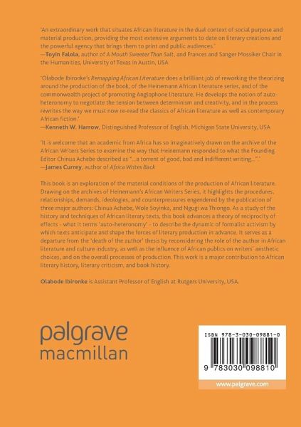 "Remapping African Literature makes a significant contribution to the decolonizing discourse in African literature ... . It is noteworthy that this observation of the dialectical relation of authorial decolonizing responses reproduced in the process of constraining imperial schemes remains a valid entry-point for a wide range of postcolonial literary experiences." (Henry Obi Ajumeze, African Studies Review, Vol. 62 (3), September, 2019)