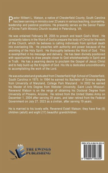 Pastor Wilbert L. Watson, a native of Chesterfield County, South Carolina has been serving in ministry over 23 years in various teaching, counseling, leadership and pastoral positions. He presently serves as the Senior Pastor of Divine Faith Ministry Church located in Petersburg, VA.He was ordained February 08, 2005 to preach and teach God's Word. He constantly labors in the Word of God to prepare the body of Christ for the work of the Church, which he believes is calling individuals from spiritual death into everlasting life. He preaches with authority and power because of the anointing of the Holy Spirit. He thoroughly believes the Word of God. This is exemplified in his message and delivery. He has been divinely positioned with opportunities to draw people closer to God wholeheartedly in Spirit and in Truth. He has a yearning desire to proclaim the Gospel of Jesus Christ and to help build-up the Kingdom of God. His life is dedicated unconditionally to accomplishing the work of the Lord.He was educated and graduated from Chesterfield High School of Chesterfield, South Carolina in 1975. In 1994 he earned his Bachelor of Science degree from University of Maryland, College Park Maryland. In 2002 he earned his Master of Arts Degree from Webster University, Saint Louis Missouri. Reverend Watson is on the verge of obtaining his Doctoral Degree from University of Phoenix, Arizona. He retired from the United States Army on December 1, 2004 after serving 29 years, and later retired from the Federal Government on July 27, 2023 as a civilian, after serving 19 years.He is married to his lovely wife, Reverend Estell Watson; they have five (5) children (adult) and eight (17) beautiful grandchildren.