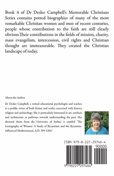 Book 4 of Dr Deslee Campbell's Memorable Christians Series contains potted biographies of many of the most remarkable Christian women and men of recent centuries, people whose contribution to the faith are still clearly obvious.Their contributions in the fields of mission, charity, mass evangelism, intercession, civil rights and Christian thought are immeasurable. They created the Christian landscape of today.