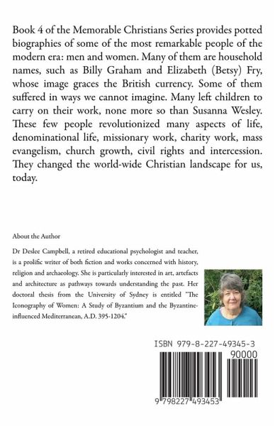 Book 4 of the Memorable Christians Series provides potted biographies of some of the most remarkable people of the modern era: men and women. Many of them are household names, such as Billy Graham and Elizabeth (Betsy) Fry, whose image graces the British currency. Some of them suffered in ways we cannot imagine. Many left children to carry on their work, none more so than Susanna Wesley. These few people revolutionized many aspects of life, denominational life, missionary work, charity work, mass evangelism, church growth, civil rights and intercession. They changed the world-wide Christian landscape for us, today.