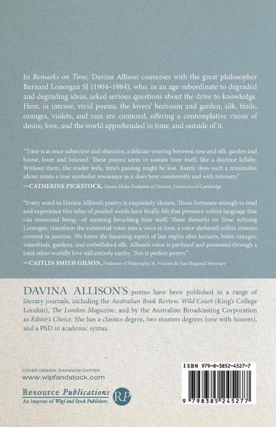 In Remarks on Time, Davina Allison converses with the great philosopher Bernard Lonergan SJ (1904–1984), who, in an age subordinate to degraded and degrading ideas, asked serious questions about the drive to knowledge. Here, in intense, vivid poems, the lovers’ bedroom and garden, silk, birds, oranges, violets, and rain are conjured, offering a contemplative vision of desire, love, and the world apprehended in time, and outside of it.