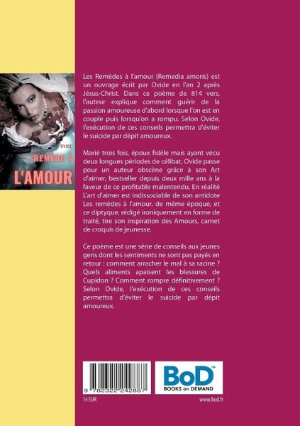 Les Remèdes à l'amour (Remedia amoris) est un ouvrage écrit par Ovide en l'an 2 après Jésus-Christ. Dans ce poème de 814 vers, l'auteur explique comment guérir de la passion amoureuse d'abord lorsque l'on est en couple puis lorsqu'on a rompu. Selon Ovide, l'exécution de ces conseils permettra d'éviter le suicide par dépit amoureux.Marié trois fois, époux fidèle mais ayant vécu deux longues périodes de célibat, Ovide passe pour un auteur obscène grâce à son Art d'aimer, bestseller depuis deux mille ans à la faveur de ce profitable malentendu. En réalité L'art d'aimer est indissociable de son antidote Les remèdes à l'amour, de même époque, et ce diptyque, rédigé ironiquement en forme de traité, tire son inspiration des Amours, carnet de croquis de jeunesse.Ce poème est une série de conseils aux jeunes gens dont les sentiments ne sont pas payés en retour : comment arracher le mal à sa racine ? Quels aliments apaisent les blessures de Cupidon ? Comment rompre définitivement ? Selon Ovide, l'exécution de ces conseils permettra d'éviter le suicide par dépit amoureux.