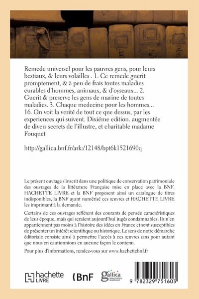 Remede universel pour les pauvres gens, pour leurs bestiaux, & leurs volailles . 1. Ce remede guerit promptement, & à peu de frais toutes maladies curables d'hommes, animaux, & d'oyseaux... 2. Guerit & preserve les gens de marine de toutes maladies. 3. Chaque medecine pour les hommes... 16. On voit la verité de tout ce que dessus, par les experiences qui suivent. Dixiéme edition. augmentée de divers secrets de l'illustre, et charitable madame Fouquet Date de l'édition originale: 1683 Le présent ouvrage s'inscrit dans une politique de conservation patrimoniale des ouvrages de la littérature Française mise en place avec la BNF. HACHETTE LIVRE et la BNF proposent ainsi un catalogue de titres indisponibles, la BNF ayant numérisé ces oeuvres et HACHETTE LIVRE les imprimant à la demande. Certains de ces ouvrages reflètent des courants de pensée caractéristiques de leur époque, mais qui seraient aujourd'hui jugés condamnables. Ils n'en appartiennent pas moins à l'histoire des idées en France et sont susceptibles de présenter un intérêt scientifique ou historique. Le sens de notre démarche éditoriale consiste ainsi à permettre l'accès à ces oeuvres sans pour autant que nous en cautionnions en aucune façon le contenu. Pour plus d'informations, rendez-vous sur www.hachettebnf.fr