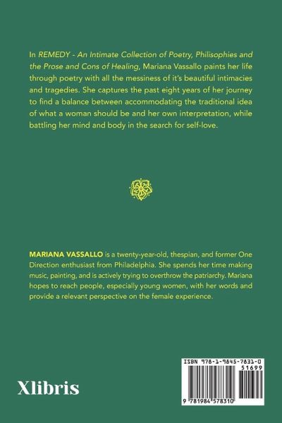 In REMEDY - An Intimate Collection of Poetry, Philisophies and the Prose and Cons of Healing, Mariana Vassallo paints her life through poetry with all the messiness of it's beautiful intimacies and tragedies. She captures the past eight years of her journey to find a balance between accommodating the traditional idea of what a woman should be and her own interpretation, while battling her mind and body in the search for self-love.