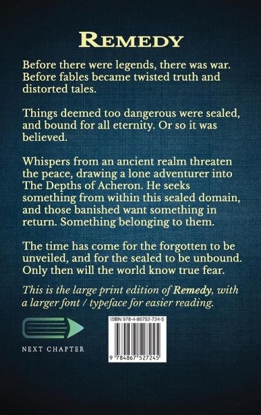 Solo Medalist Winner, New Apple Award for Excellence (Fantasy) Independent Author Network, Finalist, Book Of The Year Awards (Action & Adventure) Readers Favorite 2018 Award for Adventure Semi-finalist in 2019 Kindle Book Awards Before there were legends, there was war. Before fables became twisted truth and distorted tales. Things deemed too dangerous were sealed, and bound for all eternity. Or so it was believed. Whispers from an ancient realm threaten the peace, drawing a lone adventurer into The Depths of Acheron. He seeks something from within this sealed domain, and those banished want something in return. Something belonging to them. The time has come for the forgotten to be unveiled, and for the sealed to be unbound. Only then will the world know true fear. Each book in The Forgotten Legacies series reads as stand alone, and donates a percent of royalties to The DMWS: an independent charity supporting those who put themselves in harm's way to serve our country, including Armed Forces personnel, Reservists, Veterans and their families, and the police. This is the large print edition of Remedy, with a larger font / typeface for easier reading.