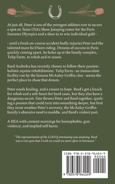 At just 28, Peter is one of the youngest athletes ever to secure a spot on Team USA's Show Jumping roster for the Paris Summer Olympics. With the support a large, equestrian-centric family behind him Peter's a shoo-in to win individual gold- -until a freak on-course accident badly injuries Peter and the talented mare he'd been riding. Dreams of success in Paris quickly coming apart, he holes up at the family complex, Tulip Farm, to rehab and re-assess. His parents and three siblings try to keep his spirits up, but it's hard to focus on the future when by night he's plagued by reoccurring headaches and by day he can barely walk without pain. Reed Androku has recently chosen to follow their passion: holistic equine rehabilitation. Tulip Farm - an immaculate facility run by the famous McAuley-Griffin clan - seems the perfect place to chase that dream, and when the family unexpectedly opens up Barn A to boarders, Reed jumps at the opportunity. They'll happily take advantage of roomy stalls, heated arena, and state-of-the-art footing even if it means putting up with Peter Griffin, the family's youngest son and ex-Olympic hopeful. Peter needs healing, and a reason to hope. Reed's got a knack for rehab and a soft-heart for hard cases, but they also have a dangerous secret. Fate throws Peter and Reed together, sparking a passion that could turn into something deeper, but first they must weather Peter's recovery, the McAuley-Griffin family's obsessive need to meddle, and Reed's violent past.