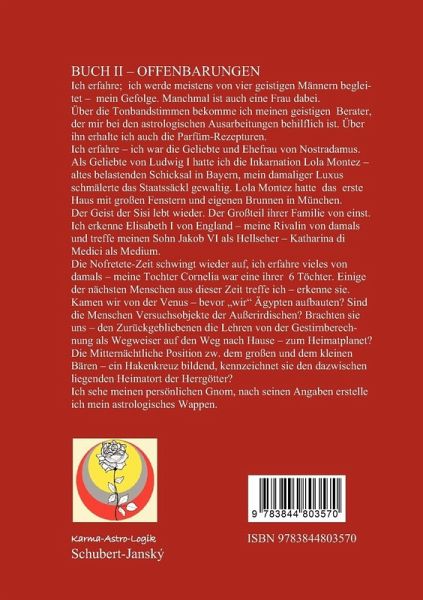 REMEMBER II - OFFENBARUNGEN Ich erfahre; ich werde meistens von vier geistigen Männern begleitet - mein Gefolge, manchmal ist auch eine Frau dabei. Über die Tonbandstimmen bekomme ich meinen geistigen Berater, er ist mir bei den astrologischen Ausarbeitungen behilflich. Durch ihn erhalte ich auch die Parfüm-Rezepturen. Ich erfahre; ich war die Geliebte und Ehefrau von Nostradamus. Als Geliebte Ludwig I hatte ich die Inkarnation Lola Montez - altes belastendes Schicksal in Bayern, ihr Luxus schmälerte das Staatssäckl gewaltig. Lola Montez hatte das erste Haus mit großen Fenstern in München und eigenen Brunnen im Haus. - Vertrieben! Der Geist von SISI lebt wieder - ein Großteil ihrer Familie von einst. Ich erkenne Elisabeth I von England - meine Rivalin von damals und treffe meinen Sohn Jakob VI als Hellseher - Katharina di Medici als Medium. Die Nofretete-Zeit steht wieder auf, ich erfahre vieles von damals - meine Tochter Cornelia war eine ihrer 6 Töchter. Einige der nahsten Menschen aus dieser Zeit treffe ich - erkenne sie. Kamen wir von der Venus - bevor "wir" Ägypten aufbauten? Sind die Menschen Versuchsobjekte der Außerirdischen - brachten sie uns - den Zurückgebliebenen die Lehren der Gestirnberechnung als Wegweiser auf den Weg nach Hause - zum Heimatplanet? Das Hakenkreuz - die viermitternächtliche Position zw. dem Kleinen und den Großen Bären kennzeichnet sie den dazwischen liegenden Heimatort der Herrgötter? Ich sehe meinen ganz persönlichen Gnom, nach seiner Angabe erstelle ich mein astrologisches Wappen.