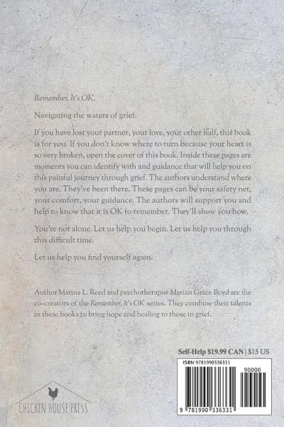 Remember, It's OK. Navigating the waters of grief. If you have lost your partner, your love, your other half, this book is for you. If you don't know where to turn because your heart is so very broken, open the cover of this book. Inside these pages are moments you can identify with and guidance that will help you on this painful journey through grief. The authors understand where you are. They've been there. These pages can be your safety net, your comfort, your guidance. The authors will support you and help to know that it is OK to remember. They'll show you how. You're not alone. Let us help you begin. Let us help you through this difficult time. Let us help you find yourself again. Author Marina L. Reed and psychotherapist Marian Grace Boyd are the co-creators of the Remember, It's OK series. They combine their talents in these books to bring hope and healing to those in grief.