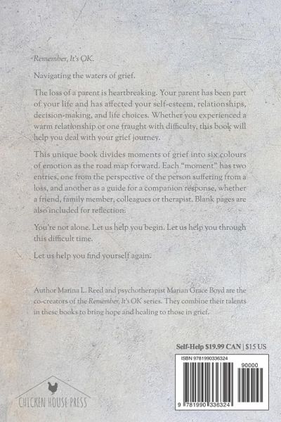 Remember, It's OK. Navigating the waters of grief. The loss of a parent is heartbreaking. Your parent has been part of your life and has affected your self-esteem, relationships, decision-making, and life choices. Whether you experienced a warm relationship or one fraught with difficulty, this book will help you deal with your grief journey. This unique book divides moments of grief into six colours of emotion as the road map forward. Each "moment" has two entries, one from the perspective of the person suffering from a loss, and another as a guide for a companion response, whether a friend, family member, colleagues or therapist. Blank pages are also included for reflection. You're not alone. Let us help you begin. Let us help you through this difficult time. Let us help you find yourself again. Author Marina L. Reed and psychotherapist Marian Grace Boyd are the co-creators of the Remember, It's OK series. They combine their talents in these books to bring hope and healing to those in grief.