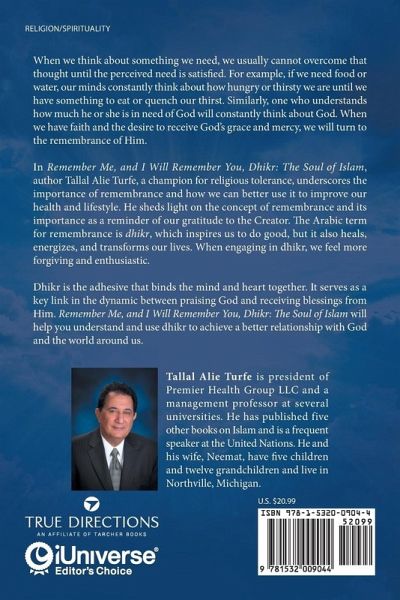 When we think about something we need, we usually cannot overcome that thought until the perceived need is satisfied. For example, if we need food or water, our minds constantly think about how hungry or thirsty we are until we have something to eat or quench our thirst. Similarly, one who understands how much he or she is in need of God will constantly think about God. When we have faith and the desire to receive God's grace and mercy, we will turn to the remembrance of Him. In Remember Me, and I Will Remember You, Dhikr: The Soul of Islam, author Tallal Alie Turfe, a champion for religious tolerance, underscores the importance of remembrance and how we can better use it to improve our health and lifestyle. He sheds light on the concept of remembrance and its importance as a reminder of our gratitude to the Creator. The Arabic term for remembrance is dhikr, which inspires us to do good, but it also heals, energizes, and transforms our lives. When engaging in dhikr, we feel more forgiving and enthusiastic. Dhikr is the adhesive that binds the mind and heart together. It serves as a key link in the dynamic between praising God and receiving blessings from Him. Remember Me, and I Will Remember You, Dhikr: The Soul of Islam will help you understand and use dhikr to achieve a better relationship with God and the world around us.
