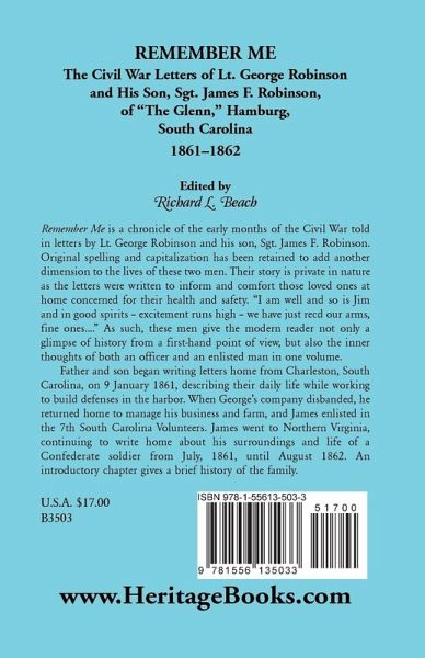 Remember Me is a chronicle of the early months of the Civil War told in letters by Lt. George Robinson and his son, Sgt. James F. Robinson. Original spelling and capitalization has been retained to add another dimension to the lives of these two men. Their story is private in nature as the letters were written to inform and comfort those loved ones at home concerned for their health and safety. "I am well and so is Jim and in good spirits - excitement runs high - we have just recd our arms, fine ones...." As such, these men give the modern reader not only a glimpse of history from a first-hand point of view, but also the inner thoughts of both an officer and an enlisted man in one volume. Father and son began writing letters home from Charleston, South Carolina, on 9 January 1861, describing their daily life while working to build defenses in the harbor. When George's company disbanded, he returned home to manage his business and farm, and James enlisted in the 7th South Carolina Volunteers. James went to Northern Virginia, continuing to write home about his surroundings and life of a Confederate soldier from July, 1861, until August 1862. An introductory chapter gives a brief history of the family.