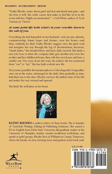 "Kathy Rhodes writes about grief and fear and denial and pain-and she does it well. She crafts scenes that make us feel like we're in the room with her. Highly recommended." -Neil White, author of In the Sanctuary of Outcasts. At some point life boils what's in your crucible down to the salt of you. Everything she had depended on her husband-job, income, identity, companionship, future hopes and dreams, even her house-and then, suddenly, he died. Kathy Rhodes staggers onto the grief road and navigates her way through the fog of disorientation, decisions, "death duties," the dreaded firsts, and basic daily survival. She lands a new job, loses it when the company fails, gets another job, loses her mother and her childhood home, then sells her own house and buys a smaller one. Five years down the road, she realizes she has journeyed from "our" to "my." She has built a whole new life. Her journey parallels the metamorphosis of the dragonfly. Dragonflies start out in the water, submerged in the dark, then gradually, in time, find their way to the skies. Rhodes survives the darkest time of her life and makes her way onward and upward. She finds the well place in her heart.