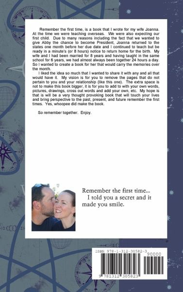 Remember the first time is a book for a couple to remember their lives together. Each page begins with a remember the first time... memory with space provided for you and your loved one to add words, pictures, drawings, cross out words and add your own, etc. My hope is that it will be a very thought-provoking book that will touch your lives and bring perspective to the past, present, and future "remember the first times". Yes, whoopee did make the book. So remember together. Enjoy.