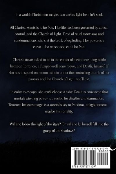 In a world of forbidden magic, two wolves fight for a lost soul. All Clarisse wants is to be free. Her life has been governed by abuse, control, and the Church of Light. Tired of ritual exorcisms and condemnations, she's at the brink of exploding. Her power is a curse-the reason she can't be free. Clarisse never asked to be in the center of a centuries-long battle between Terrence, a Reaper-wolf gone rogue, and Death, himself. If she has to spend one more minute under the controlling thumb of her parents and the Church of Light, she'll die.In order to escape, she must choose a side: Death is convinced that mortals wielding power is a recipe for disaster and damnation. Terrence believes magic is a mortal's key to freedom, enlightenment... maybe immortality. Will she follow the light of the stars? Or will she let herself fall into the grasp of the shadows?