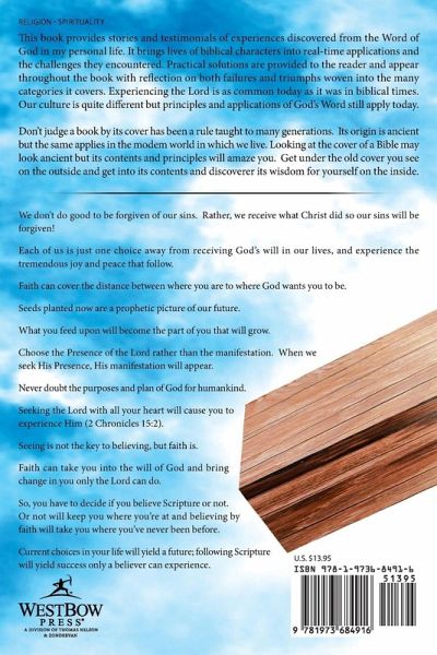 This book provides stories and testimonials of experiences discovered from the Word of God in my personal life. It brings lives of biblical characters into real-time applications and the challenges they encountered. Practical solutions are provided to the reader and appear throughout the book with reflection on both failures and triumphs woven into the many categories it covers. Experiencing the Lord is as common today as it was in biblical times. Our culture is quite different but principles and applications of God's Word still apply today. Don't judge a book by its cover has been a rule taught to many generations. Its origin is ancient but the same applies in the modem world in which we live. Looking at the cover of a Bible may look ancient but its contents and principles will amaze you. Get under the old cover you see on the outside and get into its contents and discoverer its wisdom for yourself on the inside.