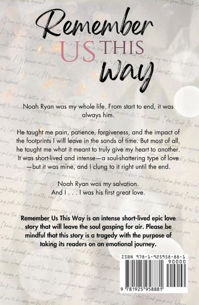 Noah Ryan was my whole life. From start to end, it was always him. He taught me pain, patience, forgiveness, and the impact of the footprints I will leave in the sands of time. But most of all, he taught me what it meant to truly give my heart to another. It was short-lived and intense-a soul-shattering type of love-but it was mine, and I clung to it right until the end. Noah Ryan was my salvation. And I . . . I was his first great love. Remember Us This Way is an intense short-lived epic love story that will leave the soul gasping for air. Please be mindful that this story is a tragedy with the purpose of taking its readers on an emotional journey.