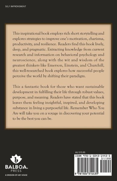 This inspirational book employs rich short storytelling and explores strategies to improve ones motivation, charisma, productivity, and resilience. Readers find this book lively, deep, and pragmatic. Extracting knowledge from current research and information on behavioral psychology and neuroscience, along with the wit and wisdom of the greatest thinkers like Emerson, Einstein, and Churchill, this well-researched book explores how successful people perceive the world by shifting their paradigm. This a fantastic book for those who want sustainable development in fulfilling their life through robust values, purpose, and meaning. Readers have stated that this book leaves them feeling insightful, inspired, and developing substance in living a purposeful life. Remember Who You Are will take you on a voyage in discovering your potential to be the best you can be.