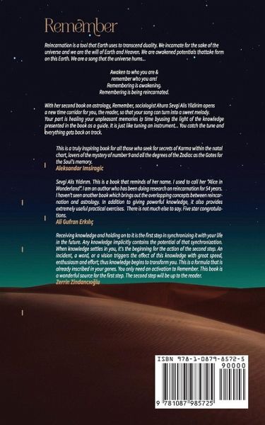 Reincarnation is a tool that Earth uses to transcend duality. We incarnate for the sake of the universe and we are the will of Earth and Heaven. We are awakened potentials that take form on this Earth. We are a song that the universe hums... Awaken to who you are & remember who you are! Remembering is awakening. Remembering is being reincarnated. With her second book on astrology, Remember, sociologist Ahura Sevgi Alis Yildirim opens a new time corridor for you, the reader, so that your song can turn into a sweet melody. Your part is healing your unpleasant memories in time by using the light of the knowledge presented in the book as a guide. It is just like tuning an instrument... You catch the tune and everything gets back on track.