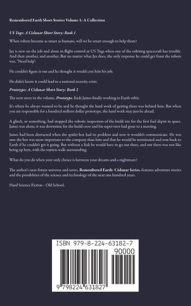 Remembered Earth Short Stories Volume 1: A Collection US Tugs: A Cislunar Short Story: Book 1 When robots become as smart as humans, will we be smart enough to help them? Jax is new on the job and alone in flight control at US Tugs when one of the orbiting spacecraft has trouble. And then another, and another. But no matter what Jax does, the only response he could get from the robots was, "Need help". He couldn't figure it out and he thought it would cost him his job. He didn't know it could lead to a national security crisis. Prototype: A Cislunar Short Story: Book 2 The next story in the volume, Prototype, finds James finally working in Earth orbit. It's where he always wanted to be and he thought the hard work of getting there was behind him. But when you are responsible for a hundred million dollar prototype, the hard work may just be ahead. A glitch, or something, had stopped the robotic inspection of the build site for the first fuel depot in space. James was alone, it was downtime for the build crew and his supervisor had gone to a meeting. James had been distracted when the spider-bot had its problem and now it wouldn't communicate. He was sure the bot was more important to the company than him and that he would be terminated and sent back to Earth if he couldn't get it going. But without a link he would have to go out there, and out there was not like being up here, with the station walls surrounding. What do you do when your only choice is between your dreams and a nightmare? The author's near-future universe and series, Remembered Earth: Cislunar Series, features adventure stories and the possiblities of the science and technology of the next one hundred years. Hard Science Fiction - Old School.