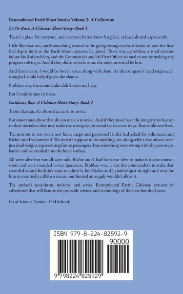 Remembered Earth Short Stories Volume 2: A Collection L1 Or Bust: A Cislunar Short Story: Book 3 There's a place for everyone, and everyone better know his place, at least aboard a spacecraft. I felt like that too, until something seemed to be going wrong on the mission to save the first fuel depot built at the Earth-Moon system's L1 point. There was a problem, a total systems failure kind of problem, and the Commander and his First Officer seemed to not be making any progress solving it. And if they didn't solve it soon, the mission would be lost. And that meant, I would be lost in space along with them. As the company's head engineer, I thought I could help if given the chance. Problem was, the commander didn't want my help. But I couldn't just sit there. Guidance Box: A Cislunar Short Story: Book 4 Those that can, do, those that can't, sit it out. But some times those that do can make a mistake. And if they don't have the integrity to face up to their mistakes, they may make the wrong decision and try to cover it up. That could cost lives. The mission to test out a new lunar cargo and personnel lander had asked for volunteers and Richie and I volunteered. We weren't suppose to do anything, we, along with a few others, were just dead weight, representing future passengers. But something went wrong with the prototype lander and we crashed into the lunar surface. All were alive but not all were safe. Richie and I had been too slow to make it to the control room and were stranded in our spacesuits. Problem was, it was the commander's mistake that stranded us and he didn't want to admit it, but Richie and I couldn't just sit tight and wait for him to eventually call for a rescue, our limited air supply wouldn't allow it. The author's near-future universe and series, Remembered Earth: Cislunar, consists of adventures that will feature the probable science and technology of the next hundred years. Hard Science Fiction - Old School.