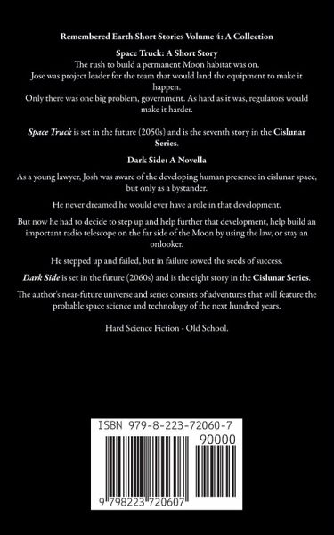 Remembered Earth Short Stories Volume 4: A Collection Space Truck: A Short Story The rush to build a permanent Moon habitat was on. Jose was project leader for the team that would land the equipment to make it happen. Only there was one big problem, government. As hard as it was, regulators would make it harder. Space Truck is set in the future (2050s) and is the seventh short story in the Remembered Earth Universe: Cislunar Series. Dark Side: A Novella As a young lawyer, Josh was aware of the developing human presence in cislunar space, but only as a bystander. He never dreamed he would ever have a role in that development. But now he had to decide to step up and help further that development, help build an important radio telescope on the far side of the Moon by using the law, or stay an onlooker. He stepped up and failed, but in failure sowed the seeds of success. Dark Side is set in the future (2060s) and is the eight story in the Remembered Earth Universe: Cislunar Series. The author's near-future universe and series consists of adventures that will feature the probable space science and technology of the next hundred years. Hard Science Fiction - Old School.