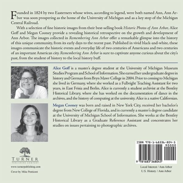 Founded in 1824 by two Easterners whose wives, according to legend, were both named Ann, Ann Arbor was soon prospering as the home of the University of Michigan and as a key stop of the Michigan Central Railroad. With a selection of fine historic images from their best-selling book Historic Photos of Ann Arbor, Alice Goff and Megan Cooney provide a revealing historical retrospective on the growth and development of Ann Arbor. The images collected in Remembering Ann Arbor offer a remarkable glimpse into the history of this unique community, from its early days to the recent past. Published in vivid black-and-white, these images communicate the historic events and everyday life of two centuries of Americans and two centuries of an important American city. Remembering Ann Arbor is sure to captivate anyone curious about the city's past, from the student of history to the local history buff.