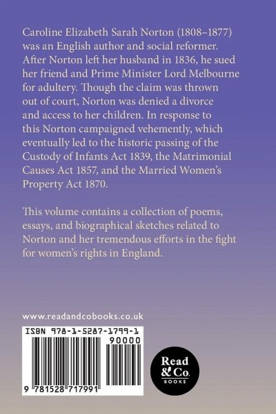 Caroline Elizabeth Sarah Norton (1808-1877) was an English author and social reformer. After Norton left her husband in 1836, he sued her friend and Prime Minister Lord Melbourne for adultery. Though the claim was thrown out of court, Norton was denied a divorce and access to her children. In response to this Norton campaigned vehemently, which eventually led to the historic passing of the Custody of Infants Act 1839, the Matrimonial Causes Act 1857, and the Married Women's Property Act 1870. This volume contains a collection of poems, essays, and biographical sketches related to Norton and her tremendous efforts in the fight for women's rights in England. Contents include: "Caroline Elizabeth Sarah Norton (Sheridan), by John W. Cousin", "Caroline Elizabeth Sarah Norton, by Richard Garnett", "Mrs. Norton, by William Bates", and "Caroline Norton, by Mabel Elizabeth Wotton". Notable works by this author include: "The Dandies Rout" (1825), "The Wife, and Woman's Reward" (1835), and "Stuart of Dunleath" (1851). Brilliant Women - Read & Co. is proudly publishing this brand new collection of classic essays now for the enjoyment of a new generation of readers.