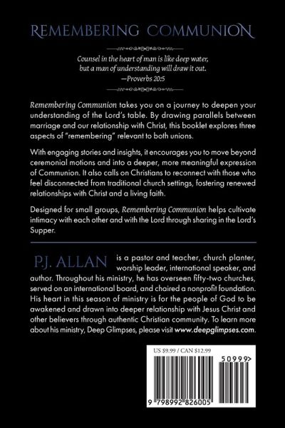 Remembering Communion takes you on a journey to deepen your understanding of the Lord's table. By drawing parallels between marriage and our relationship with Christ, this booklet explores three aspects of "remembering" relevant to both unions. With engaging stories and insights, it encourages you to move beyond ceremonial motions and into a deeper, more meaningful expression of Communion. It also calls on Christians to reconnect with those who feel disconnected from traditional church settings, fostering renewed relationships with Christ and a living faith. Designed for small groups, Remembering Communion helps cultivate intimacy with each other and with the Lord through sharing in the Lord's Supper. Remembering Communion is a booklet in Deep Glimpses, a series created to strengthen and encourage believers with deeper insights and understanding as they walk with God. To learn more about the Deep Glimpses series, please visit www.deepglimpses.com.