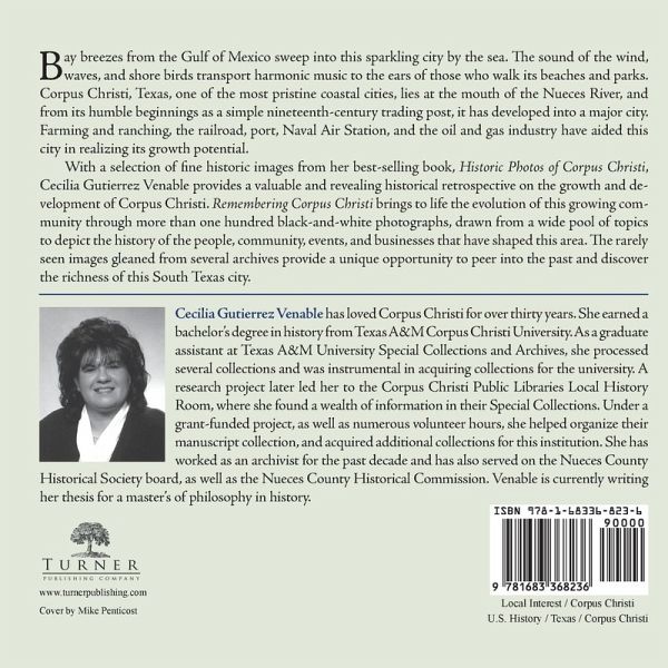 Bay breezes from the Gulf of Mexico sweep into this sparkling city by the sea. The sound of the wind, waves, and shore birds transport harmonic music to the ears of those who walk its beaches and parks. Corpus Christi, Texas, one of the most pristine coastal cities, lies at the mouth of the Nueces River, and from its humble beginnings as a simple nineteenth-century trading post, it has developed into a major city. Farming and ranching, the railroad, port, Naval Air Station, and the oil and gas industry have aided this city in realizing its growth potential. With a selection of fine historic images from her best-selling book, Historic Photos of Corpus Christi, Cecilia Gutierrez Venable provides a valuable and revealing historical retrospective on the growth and development of Corpus Christi. Remembering Corpus Christi brings to life the evolution of this growing community through more than one hundred black-and-white photographs, drawn from a wide pool of topics to depict the history of the people, community, events, and businesses that have shaped this area. The rarely seen images gleaned from several archives provide a unique opportunity to peer into the past and discover the richness of this South Texas city.