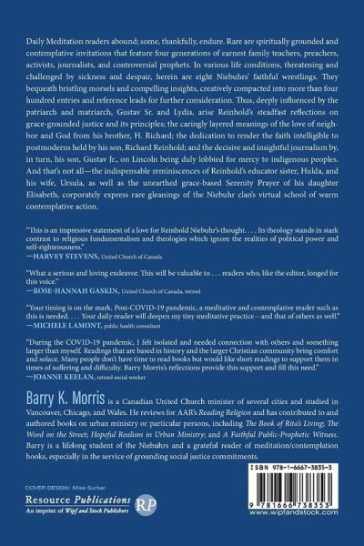 Daily Meditation readers abound; some, thankfully, endure. Rare are spiritually grounded and contemplative invitations that feature four generations of earnest family teachers, preachers, activists, journalists, and controversial prophets. In various life conditions, threatening and challenged by sickness and despair, herein are eight Niebuhrs' faithful wrestlings. They bequeath bristling morsels and compelling insights, creatively compacted into more than four hundred entries and reference leads for further consideration. Thus, deeply influenced by the patriarch and matriarch, Gustav Sr. and Lydia, arise Reinhold's steadfast reflections on grace-grounded justice and its principles; the caringly layered meanings of the love of neighbor and God from his brother, H. Richard; the dedication to render the faith intelligible to postmoderns held by his son, Richard Reinhold; and the decisive and insightful journalism by, in turn, his son, Gustav Jr., on Lincoln being duly lobbied for mercy to indigenous peoples. And that's not all--the indispensable reminiscences of Reinhold's educator sister, Hulda, and his wife, Ursula, as well as the unearthed grace-based Serenity Prayer of his daughter Elisabeth, corporately express rare gleanings of the Niebuhr clan's virtual school of warm contemplative action.