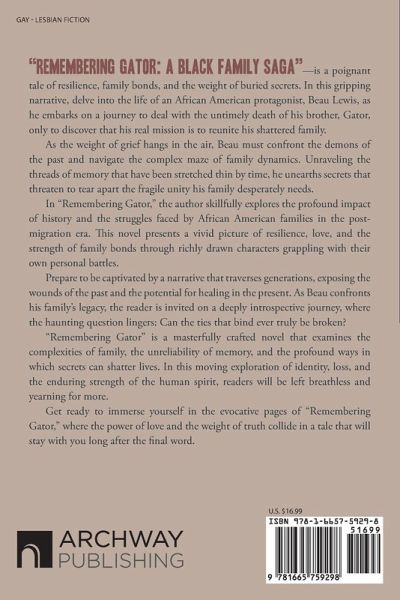 "Remembering Gator: A Black Family Saga"-is a poignant tale of resilience, family bonds, and the weight of buried secrets. In this gripping narrative, delve into the life of an African American protagonist, Beau Lewis, as he embarks on a journey to deal with the untimely death of his brother, Gator, only to discover that his real mission is to reunite his shattered family. As the weight of grief hangs in the air, Beau must confront the demons of the past and navigate the complex maze of family dynamics. Unraveling the threads of memory that have been stretched thin by time, he unearths secrets that threaten to tear apart the fragile unity his family desperately needs. In "Remembering Gator," the author skillfully explores the profound impact of history and the struggles faced by African American families in the post-migration era. This novel presents a vivid picture of resilience, love, and the strength of family bonds through richly drawn characters grappling with their own personal battles. Prepare to be captivated by a narrative that traverses generations, exposing the wounds of the past and the potential for healing in the present. As Beau confronts his family's legacy, the reader is invited on a deeply introspective journey, where the haunting question lingers: Can the ties that bind ever truly be broken? "Remembering Gator" is a masterfully crafted novel that examines the complexities of family, the unreliability of memory, and the profound ways in which secrets can shatter lives. In this moving exploration of identity, loss, and the enduring strength of the human spirit, readers will be left breathless and yearning for more. Get ready to immerse yourself in the evocative pages of "Remembering Gator," where the power of love and the weight of truth collide in a tale that will stay with you long after the final word.