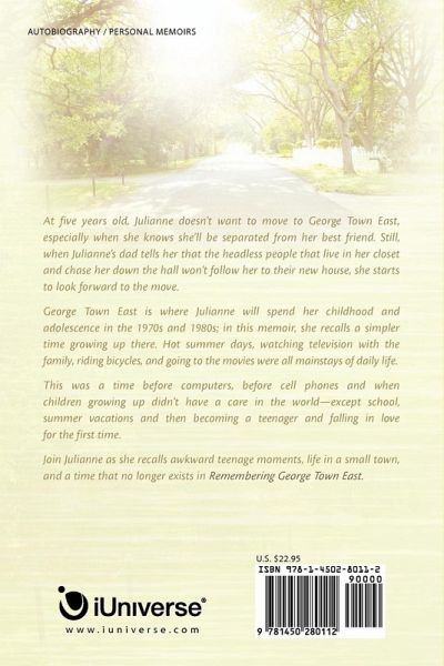 At five years old, Julianne doesn't want to move to George Town East, especially when she knows she'll be separated from her best friend. Still, when Julianne's dad tells her that the headless people that live in her closet and chase her down the hall won't follow her to their new house, she starts to look forward to the move. George Town East is where Julianne will spend her childhood and adolescence in the 1970s and 1980s; in this memoir, she recalls a simpler time growing up there. Hot summer days, watching television with the family, riding bicycles, and going to the movies were all mainstays of daily life. This was a time before computers, before cell phones and when children growing up didn't have a care in the world-except school, summer vacations and then becoming a teenager and falling in love for the first time. Join Julianne as she recalls awkward teenage moments, life in a small town, and a time that no longer exists in Remembering George Town East.