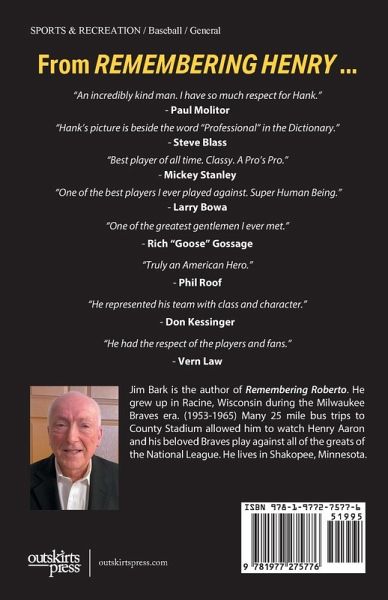 Henry Aaron was admired and respected by his former teammates and opponents. REMEMBERING HENRY offers written proof. Jim Bark wrote to former MLB players and asked them to share some thoughts on Henry Aaron. This book is a collection of their replies. Done in a similar format as his first book REMEMBERING ROBERTO, each comment is accompanied by a baseball card of the player along with a brief biography. Among the players contributing to this book are Darrell Evans, Ralph Garr, Tom House, Paul Molitor, Jim Colborn, Goose Gossage, Bobby Richardson, Don Kessinger, George Altman, Steve Blass, Bobby Shantz, Larry Bowa, and Jon Matlack. A nice tribute to Henry Aaron, the player and the man.