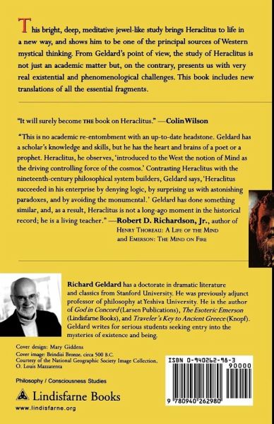 Fragments of Heraclitus: "To be wise is one thing: to know the thought that directs all things through all things." "We should not act like the children of our parents." This bright, deep, meditative jewel-like study brings Heraclitus to life in a new way, and shows him to be one of the principal sources of Western mystical thinking. From Geldard's point of view, the study of Heraclitus is not just an academic matter but, on the contrary, presents us with very real existential and phenomenological challenges. The book includes new translations of all the essential fragments. Geldard, through his exploration of Heraclitus, shows us, "The more that human beings openly and humbly seek higher knowledge, the more they develop the power to perceive it, until finally they penetrate to the hidden universal order. The result of this penetration is knowledge of the Logos, that 'which directs all things through all things.' The acquisition of this knowledge is not an event; it is a stance in the world. It is Being in its fullness."