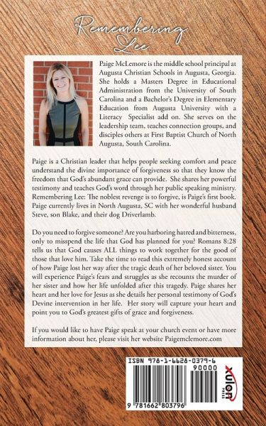 Paige McLemore is the middle school principal at Augusta Christian Schools in Augusta, Georgia. She holds a Masters Degree in Educational Administration from the University of South Carolina and a Bachelor's Degree in Elementary Education from Augusta University with a Literacy Specialist add on. She serves on the leadership team, teaches connection groups, and disciples others at First Baptist Church of North Augusta, South Carolina. Paige is a Christian leader that helps people seeking comfort and peace understand the divine importance of forgiveness so that they know the freedom that God's abundant grace can provide. She shares her powerful testimony and teaches God's word through her public speaking ministry. Remembering Lee: The noblest revenge is to forgive, is Paige's first book. Paige currently lives in North Augusta, SC with her wonderful husband Steve, son Blake, and their dog Driverlamb. Do you need to forgive someone? Are you harboring hatred and bitterness, only to misspend the life that God has planned for you? Romans 8:28 tells us that God causes ALL things to work together for the good of those that love him. Take the time to read this extremely honest account of how Paige lost her way after the tragic death of her beloved sister. You will experience Paige's fears and struggles as she recounts the murder of her sister and how her life unfolded after this tragedy. Paige shares her heart and her love for Jesus as she details her personal testimony of God's Devine intervention in her life. Her story will capture your heart and point you to God's greatest gifts of grace and forgiveness. If you would like to have Paige speak at your church event or have more information about her, please visit her website Paigemclemore.com